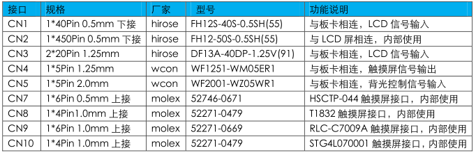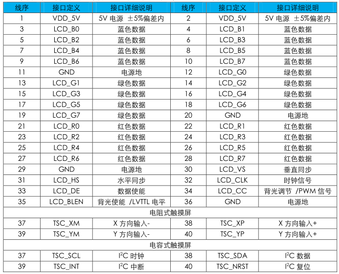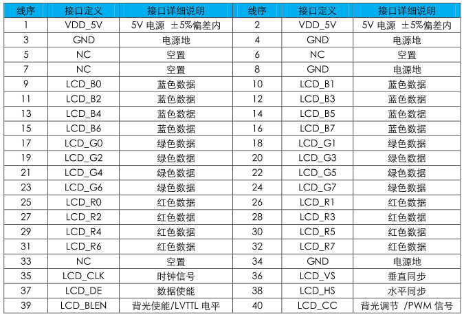 2.如使用其他廠商硬件開(kāi)發(fā)平臺(tái)產(chǎn)品,請(qǐng)參考下表接線定義及開(kāi)發(fā)平臺(tái)的LCD接口定義,并對(duì)應(yīng)相連