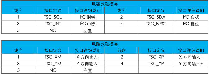 當(dāng)使用CN3接口時(shí),用戶板卡觸摸控制接口與CN4對(duì)應(yīng)相連才能實(shí)現(xiàn)觸摸控制。EAC-LCD70L兩種觸摸屏對(duì)應(yīng)的CN4接口定義如下表,用戶需要根據(jù)模塊所用的觸摸屏類型對(duì)應(yīng)接口定義。