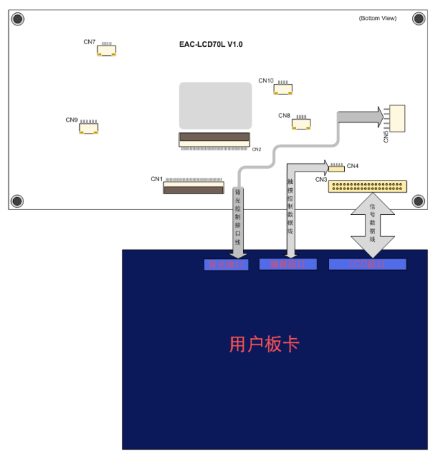 3.選用CN3時(shí)板卡與設(shè)配板接口接線示意圖如下:(觸摸控制連接到CN4,背光控制連到CN3或者獨(dú)立到背光控制接口CN5)