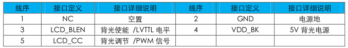 背光控制引線可通過(guò)CN3與用戶板卡相連,可以通過(guò)獨(dú)立接口CN5與板卡相連,用戶可根據(jù)自己的開(kāi)發(fā)硬件平臺(tái)自行選擇,CN5引腳定義如下表: