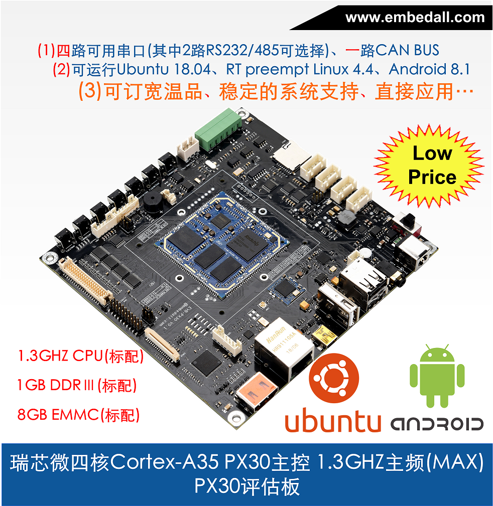 px30工業級四核處理器,集成四個Cortex-A35,雙核Mali-G31 GPU,穩定運行Android 8.0/Ubuntu 20.04/Linux 4.4。
