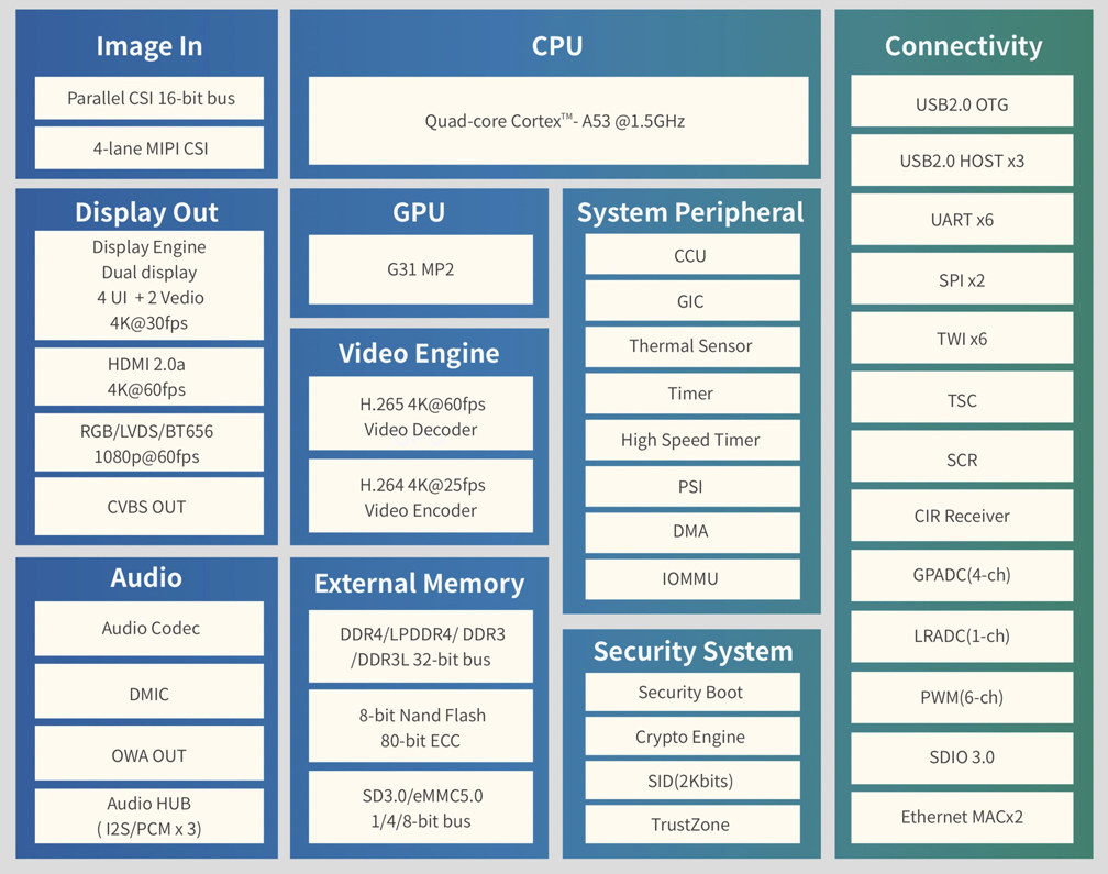 l 采用Allwinner公司Cortex-A53四核T507車規級處理器,運行最高速度為1.5GHZ;