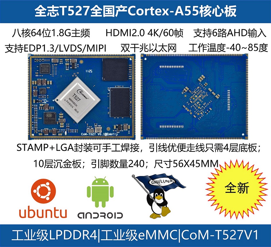 CoM-X527核心模塊屬于盈鵬飛嵌入式Computer-on-Module系列,該產(chǎn)品集成了八核 Cortex-A55 2.0GHz(MAX) A527處理器或者T527車規(guī)級(jí)處理器,穩(wěn)定運(yùn)行Android 13.0/Ubuntu 22.04/Linux 5.15。CoM-X527可提供雙千兆以太網(wǎng)接口;支持MIPI-CSI輸入,4+4lane,4+2+2lane,2+2+2+2lane;支持10路串口;支持HDMI2.0B/EDP1.3/LVDS/MIPI DSI顯示;特定型號(hào)還支持2TOPS的NPU, 為圖像處理及畫質(zhì)增強(qiáng)等AI應(yīng)用提供了性能支持;它還還提供了3.3V I/O接口,可提供寬溫的工業(yè)組件,運(yùn)行于條件惡劣的工業(yè)現(xiàn)場(chǎng)!該產(chǎn)品可應(yīng)用于智能座艙、輔助駕駛、智慧工業(yè)、行業(yè)智能、智能電網(wǎng)等領(lǐng)域,我司提供各種參考設(shè)計(jì)。