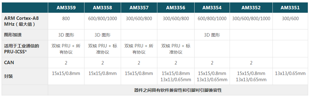 1.處理器采用系列化,從高端過渡到低端,滿足不同行業(yè)客戶的各種功能需求,達(dá)到性價(jià)比最優(yōu)的微妙平衡。分別有AM3359/AM3358/AM3357/AM3356/AM3354等多款配置參數(shù)各不相同的處理