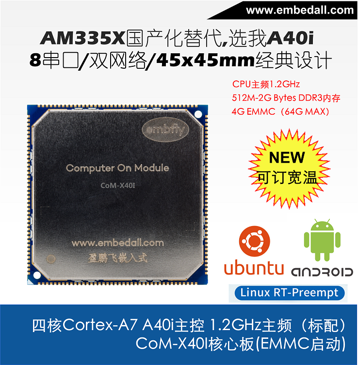 A40i為國產工控行業芯,是全志科技布局工控行業的重要產品,采用更低功耗的4核ARM Cortex-A7,工業品質100ppm,工作溫度范圍-40-85℃,是一款高性能低功耗超高性價比的行業應用處理器,支持Android&Linux雙系統,十年以上供貨周期。是CoM-X40I核心模塊的工程底板的參考設計,該產品集成了四核 Cortex-A7 1.2GHz(MAX) A40I 處理器,穩定運行Android 7.0/Ubuntu 16.04/Linux 3.10。 SBC-X40I提供了3.3V I/O接口,可提供寬溫的工業組件,運行于條件惡劣的工業現場!