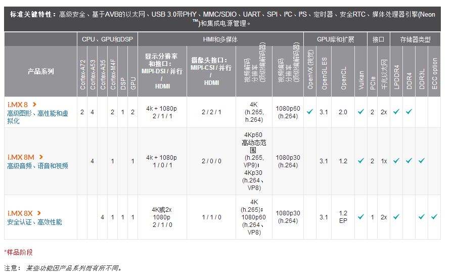 德克薩斯州奧斯丁,2016年5月17日訊(恩智浦FTF 2016)– 恩智浦半導體(NXP Semiconductors N.V.)(納斯達克代碼:NXPI)今天展示了新一代i.MX 8應(yīng)用處理器安全、生動、高交互性接口的應(yīng)用潛能。 標準關(guān)鍵特性 基于i.MX 8多傳感器處理器系列的多傳感器實現(xiàn)套件(MEK)。該傳感器可以通過提升高要求計算和媒體密集型應(yīng)用中的多媒體和顯示接口性能改善日常交互體驗。 IMX8-MEK 全新的i.MX 8多傳感器實現(xiàn)套件兼具業(yè)界最具擴展性的應(yīng)用處理器系列、高水準的系統(tǒng)安全性以及出色的能效。該套件提供系統(tǒng)分區(qū)功能,方便開發(fā)人員以硬件定義的安全性專注于創(chuàng)新應(yīng)用的軟件定義結(jié)果,確保互聯(lián)汽車、互聯(lián)醫(yī)療、工業(yè)機械與工具等各種關(guān)鍵應(yīng)用的安全與隱私。利用i.MX 8智能架構(gòu),可以安全地訪問和提取數(shù)據(jù),供消費者與企業(yè)使用。 恩智浦資深副總裁、微控制器業(yè)務(wù)線總經(jīng)理Geoff Lees表示:“超動力計算時代的到來有望顛覆我們工作、生活和娛樂的方式。在這個GPU加速的新世界中,消費者將能享受令人驚嘆的人與互聯(lián)設(shè)備的交互體驗。i.MX 8架構(gòu)為開發(fā)人員提供了發(fā)揮想象并設(shè)計自然人機交互的自由,將惠及生活中的方方面面。” 多傳感器:任何物體或表面的生動體驗 i.MX 8旨在通過強大的媒體引擎增強交互活動。它具有4K視頻和圖形性能,可應(yīng)用于大多數(shù)物體或表面,提高虛擬或增強現(xiàn)實的使用體驗。這項技術(shù)為開發(fā)人機交互——比如機器人和視覺檢測、家用或商用無人機、可穿戴設(shè)備等——提供了機會,可將掃描功能應(yīng)用與現(xiàn)代工業(yè)的自動化和效率提升。 私密與個性化交互 i.MX 8智能架構(gòu)在消費者易用性以及最高安全水準之間實現(xiàn)了平衡。該架構(gòu)從最基本的高級安全性做起,具有軟件和硬件平臺分離的特點,提供關(guān)鍵故障/恢復選項,保護數(shù)字特征,同時安全地實現(xiàn)互聯(lián)的數(shù)字化界面。 關(guān)鍵應(yīng)用的易用性和安全性 i.MX 8推動了多傳感器進步,可用于直觀手勢控制、語音識別、自然語音識別和音頻加速。在諸如醫(yī)療保健或工業(yè)實現(xiàn)(比如互聯(lián)車輛)等任務(wù)關(guān)鍵型應(yīng)用中,i.MX 8技術(shù)讓體驗配置與數(shù)字特征相匹配。例如,在互聯(lián)汽車中,重要的駕駛信息經(jīng)過配置并顯示在信息娛樂、儀表盤、高級抬頭顯示器等多個顯示屏幕上,可以設(shè)計座椅調(diào)節(jié)、音樂音量以及設(shè)備連接等個性化設(shè)置,增強駕駛樂趣和安全性。 深圳盈鵬飛嵌入式已經(jīng)評估了該套件,功能還是相當?shù)膹姶蟮摹Si飛嵌入式后續(xù)會繼續(xù)關(guān)注i.MX 8系列的產(chǎn)品相關(guān)消息,為廣大網(wǎng)友提供給第一手的行業(yè)資訊。也可以掃一掃關(guān)注盈鵬飛官方公眾號,為您提供更多的行業(yè)資訊,技術(shù)服務(wù),產(chǎn)品咨詢等... i.MX 8系列應(yīng)用處理器:多核,Arm® Cortex®-A72,Cortex-A53,Cortex-A35,Cortex-M4內(nèi)核。該系列應(yīng)用處理器是一種功能和性能可擴展的多核平臺,包括基于Arm ® Cortex ®架構(gòu)的單核、雙核和四核系列產(chǎn)品,提供基于Cortex-A72 + Cortex-A53組合、Cortex-A35和Cortex-M4的解決方案,適用于高級圖形、成像、機器視覺、音頻、語音、視頻和安全關(guān)鍵應(yīng)用。i.MX 8目前官網(wǎng)推出了三個系列,有i.MX 8、i.MX 8M、i.MX 8X。三個系列都還木有正式上市,都是屬于樣品階段。但目前NXP推出的是i.MX8套件已經(jīng)正式上市了。