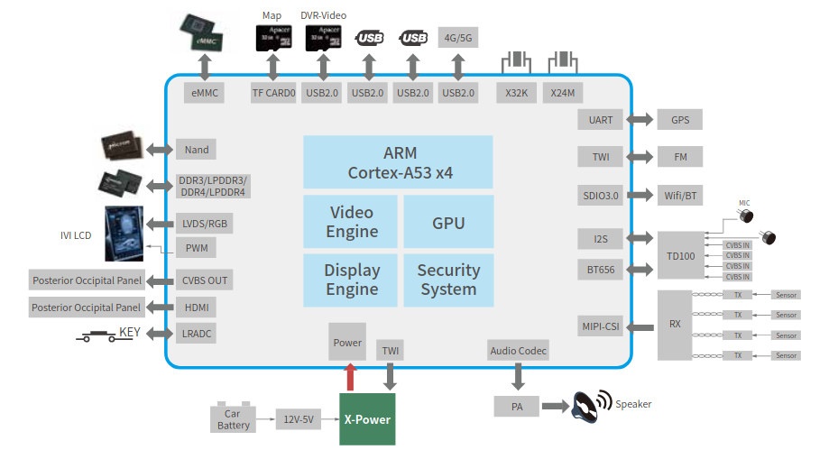 全志T5芯片是一款高性能四核Cortex-A53平臺,是專門面向汽車市場的新一代SoC,通過汽車AEC-Q100測試。全志T5集成Cortex-A53四核CPU、G31 MP2 GPU,支持32位DDR3/LPDDR3/DDR4/LPDDR4 DRAM,擁有多視頻輸出接口(RGB/2*LVDS/HDMI/CVBS-OUT),多視頻輸入接口(MIPI CSI/BT656/BT1120)。T5芯片支持4K@60fps H.265解碼,4K@25fps H.264編碼。支持DI、3D降噪、SmartColor系統和keystone校正模塊,提供流暢的用戶體驗和專業的視覺效果。T5芯片主要應用于機器視覺和高清顯示類產品。